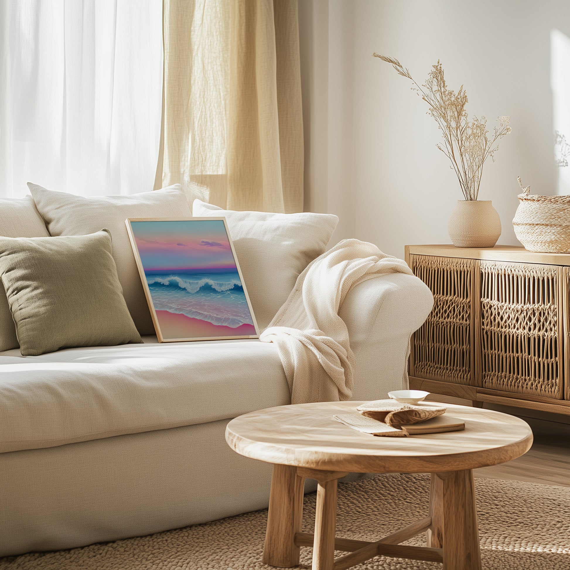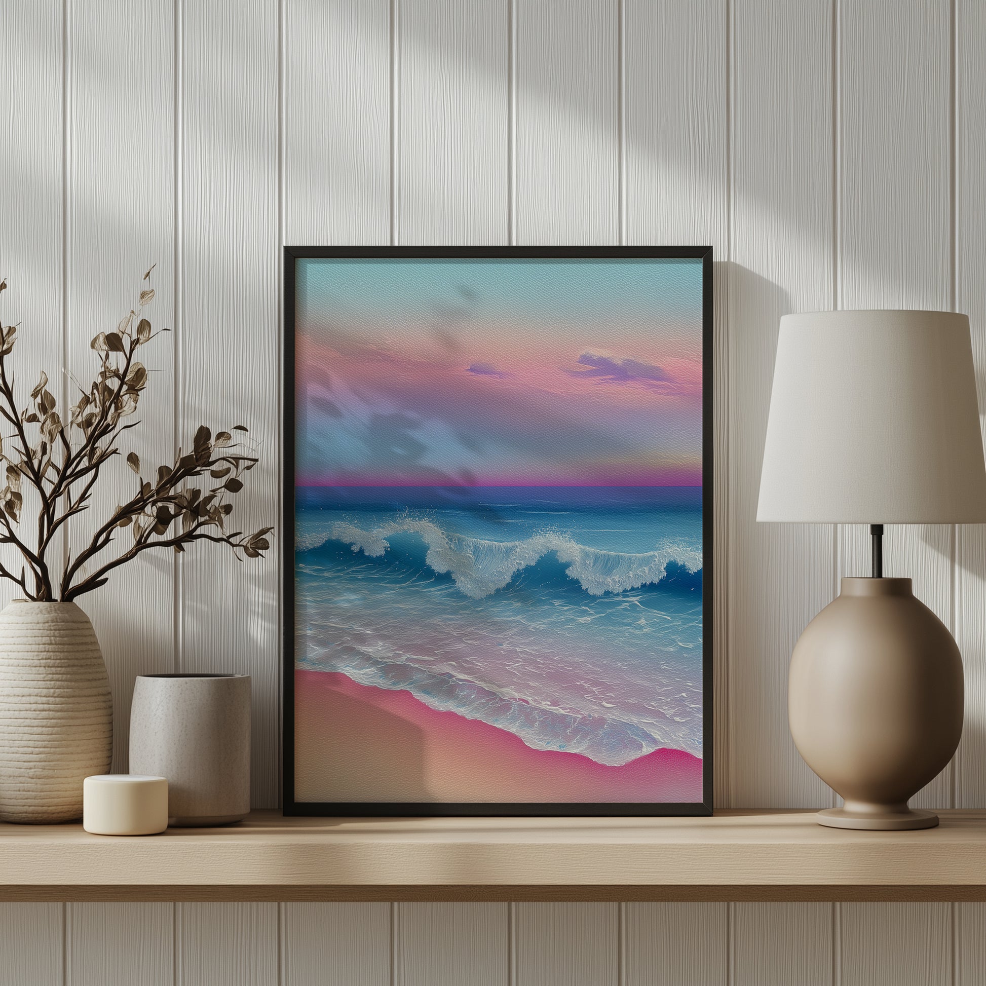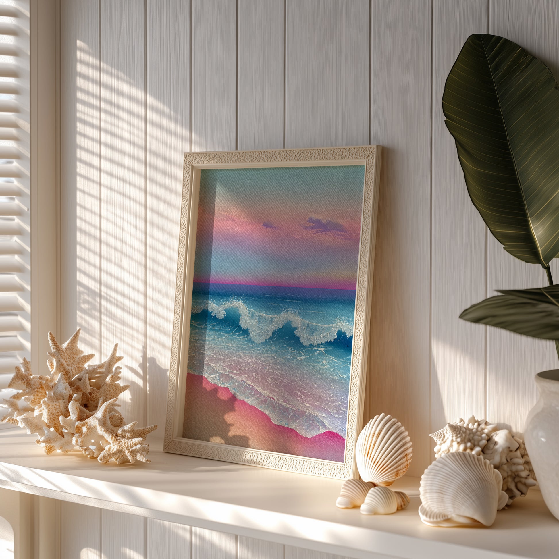 Step into a peaceful coastal retreat with this serene watercolour print. A hidden cove opens onto calm turquoise waters, framed by rugged cliffs and lush greenery. The soft interplay of light and shadow creates a soothing, tranquil atmosphere, inviting a moment of escape and relaxation. Perfect for adding a touch of coastal elegance, this print works beautifully in living rooms, bedrooms, or any space in need of a calm, nature-inspired vibe.